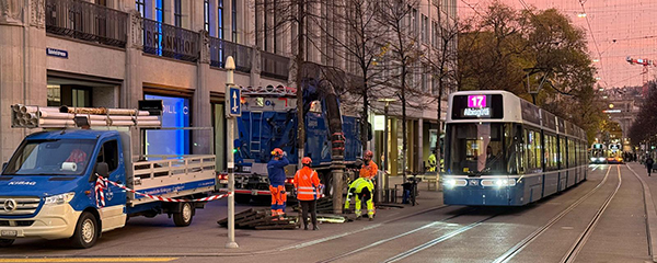 Vier Linden an der stark frequentierten Bahnhofstrasse haben kein einfaches Los, denn die bestehende Erde, in der sie sich befinden, verdichtet sich mitunter durch die Erschütterungen des Tramverkehrs stark; somit können sich die Wurzeln nicht recht entfalten. Im Auftrag von Grün Stadt Zürich wurde die KIBAG Entwässerungstechnologie also zum Gärtner: Mithilfe des Saugbaggers wurden im bestehenden Erdreich vier Bohrungen vorgenommen. Denn mit der Schaufel oder gar dem Bagger hätten die Wurzeln beschädigt werden können. Anschliessend verfüllten wir die Löcher mit einem speziellen Substrat aus Humus, Schotter und Blähton wieder. Derart «beatmet» hoffen wir also auf ein Wiederaufleben der angeschlagenen Bäume im kommenden Frühling.